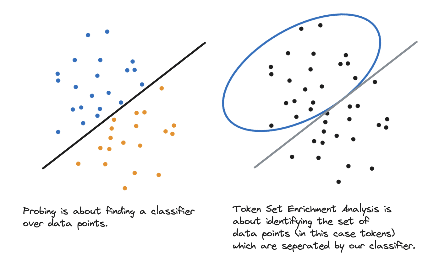 Here, we’re going to perform Token Set Enrichment Analysis, which you can think of as a kind of “reverse probing”. When probing, we train a classifier to distinguish data points according to some labels. Here, SAEs have already given us a number of classifiers (over tokens) and we wish to know which sets of tokens they mean to distinguish. The solution is to use a cheap statistical test which takes a hypothesis set of tokens, and checks whether they are elevated in the logit weight distributions.