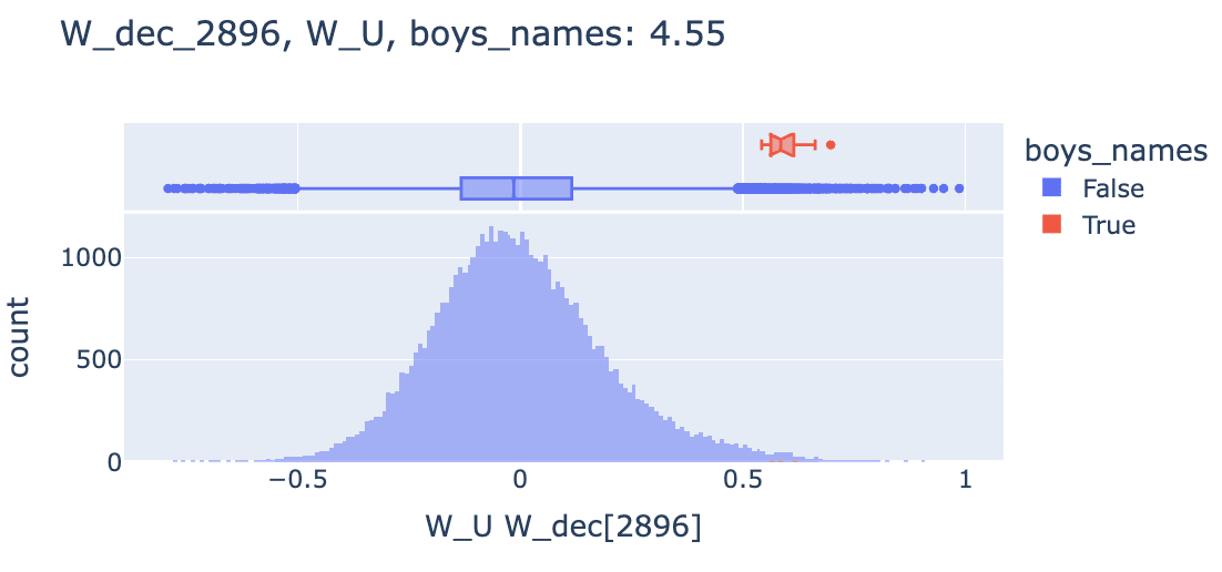 On inspection, Feature 2896 does not appear to be a name promoting feature at all, but it does appear to be highly related to gender. Clearly the 300 most common boys names are not the most promoted tokens (via direct effect) but elevated tokens not in the boys_names set include titles like “Mr” and less common boys names.