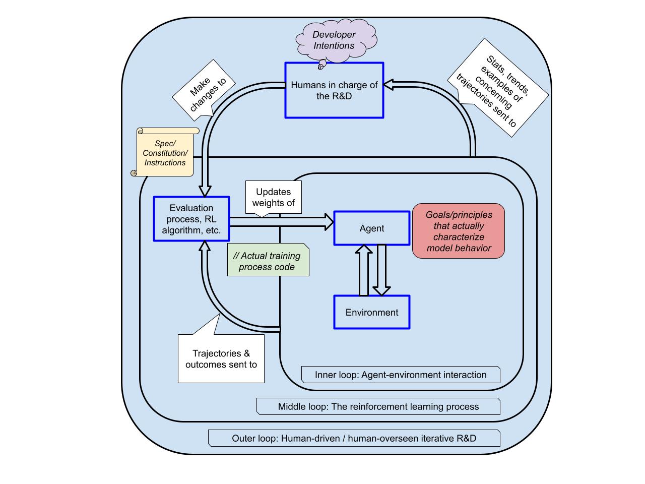 Yeah, I agree, I think that's out of scope for this doc basically. This doc is trying to figure out what the "default" outcome is, but then we have to imagine that human alignment teams are running various tests and might notice that this is happening and then course-correct. But whether and how that happens, and what the final outcome of that process is, is something easier thought about once we have a sense of what the default outcome is. EDIT: After talking to my colleague Eli it seems this was oversimplifying. Maybe this is the methodology we should follow, but in practice the original post is kinda asking about the outer loop thing.