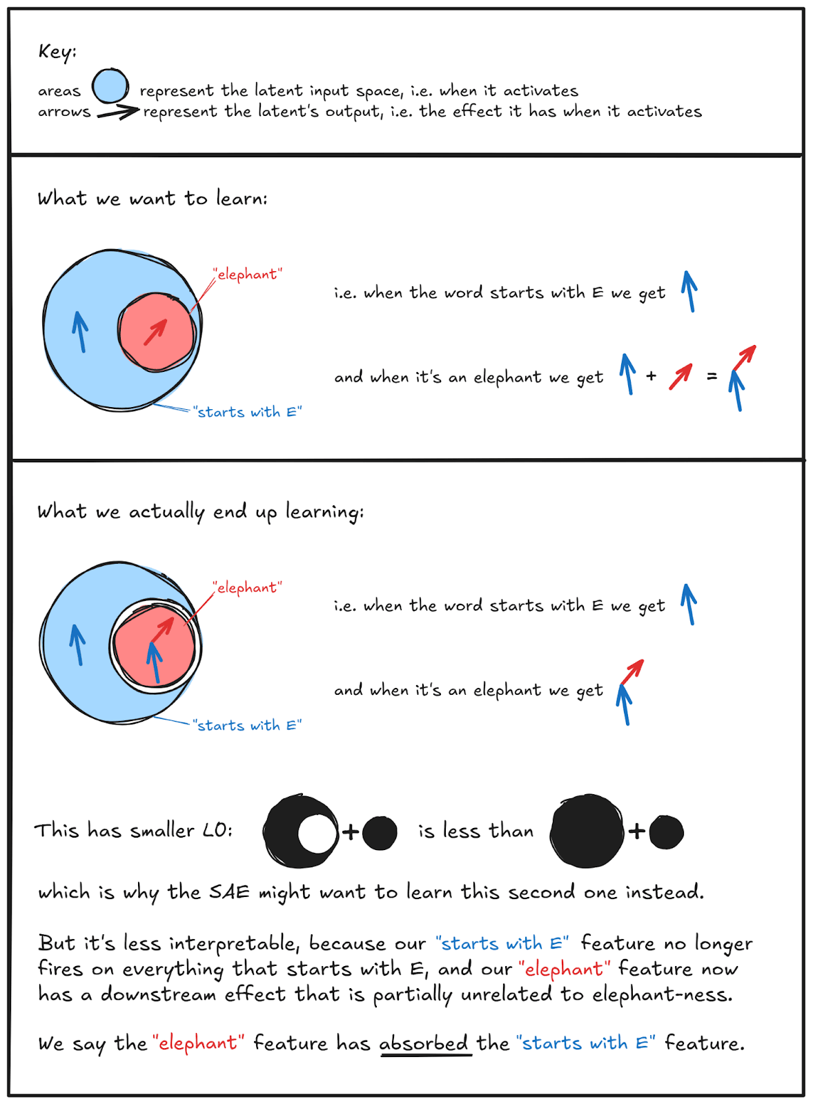 For example, consider a latent that typically fires on all words starting with the letter E, and a latent that fires on the word "elephant". When the second latent fires (i.e. word “elephant” is the input), both latents fire, which is redundant as elephant implies starts with E, so it could be sparser. Instead, the information (i.e. decoder vector) of "starts-with-E" gets absorbed by a token-specific latent that responds primarily to variations of "Elephant", and the “starts with E” latent gets warped to instead activate on “starts with E except for the world elephant”.