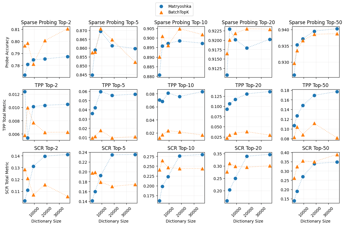 Looking at the results, we see that the k-sparse probing results are mixed. We would have expected the Matryoshka SAE performance to increase monotonically with dictionary size, as the smaller SAEs are subsets of the larger SAEs. Given that this is not the case, we suspect that the feature selection is not optimal and we are not sure how to interpret the results.