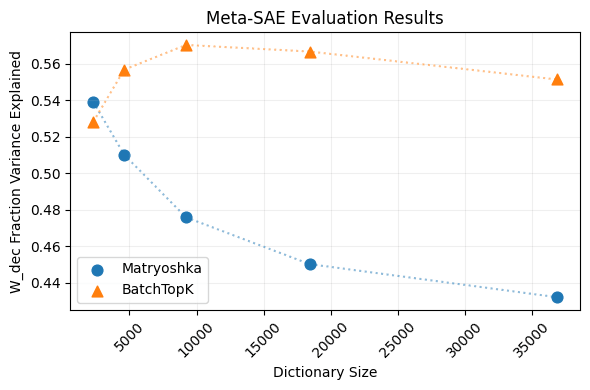 To analyze the degree of feature composition occurring in our models, we conduct an experiment using meta-SAEs trained on the decoder matrices of both architectures. For each (sub-)SAE, we train a meta-SAE with a dictionary size one-quarter that of its input SAE and an average of only 4 active meta-latents. By measuring how well these meta-SAEs can reconstruct the original decoder matrices, we gain insight into the compositional nature of the learned features. The key intuition is that if a smaller meta-SAE can explain a large portion of variance in the decoder directions, it suggests the original features are being composed from a more compact set of basic building blocks, corresponding to high-level features that got absorbed into latents for lower level features.