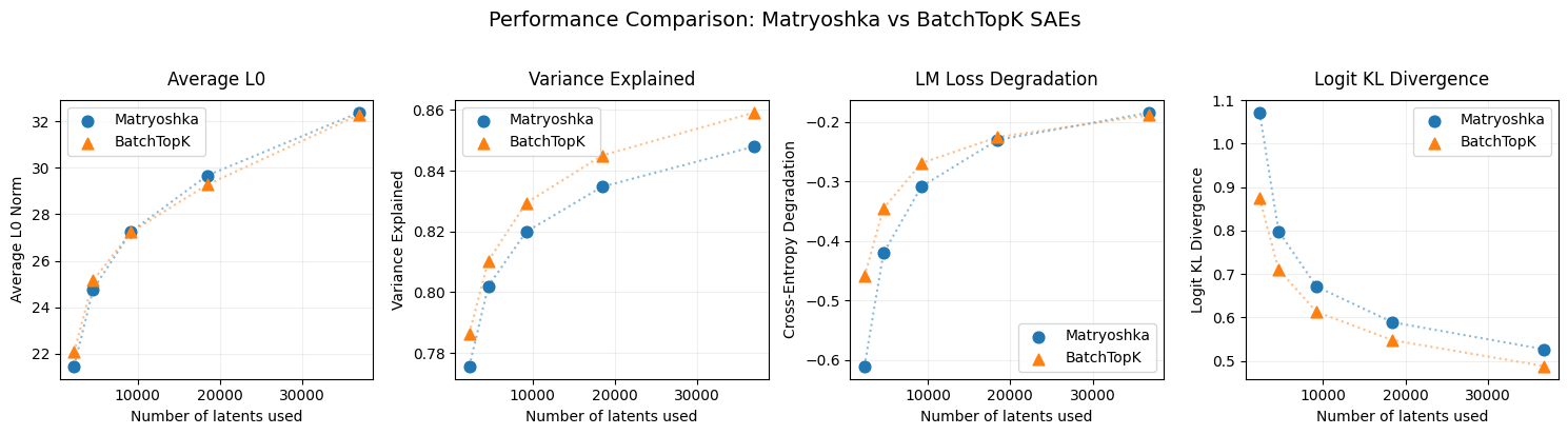 To fairly compare the performance of MatryoshkaSAEs with normal BatchTopK, we train five BatchTopK SAEs with similar dictionary sizes (2304, 4608, 9216, 18432, 36864) and average L0s (22, 25, 27, 29, 32). We evaluate the SAEs on 4096 sequences of length 128 (524288 tokens).