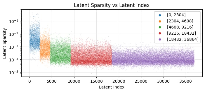 The sub-SAE with only the first 2304 latents uses approximately two-thirds of the active latents! This isn't that surprising given that these are used in five loss-terms, whereas the last 18k latents are only used in one of the loss-terms. Below we show the average frequency of activation of each latent. The five nested groups of latents are clearly visible with different levels of sparsity. Note that unlike Noa Nabeshima, we did not reorder the latents during or after training.