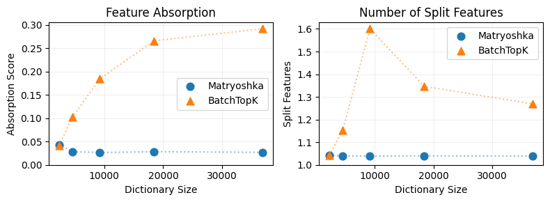 As expected, standard BatchTopK achieves better reconstruction performance (in terms of MSE and variance explained) since feature absorption helps to minimize the number of active latents. However, surprisingly, the MatryoshkaSAE achieves similar downstream cross-entropy loss at the largest dictionary sizes! We find this surprising, our best interpretation is that the Matryoshka SAE learns more meaningful features that better capture the language model's internal representations that are used for the next-token prediction, even though it reconstructs the activations less accurately.