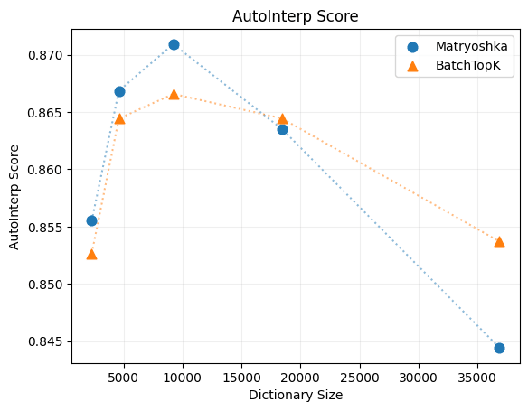 Looking at the interpretability scores, we see an interesting pattern emerge. The early nested sub-SAEs actually perform slightly better than their BatchTopK counterparts in terms of interpretability. However, this advantage doesn't hold for the later groups of latents, which show somewhat lower interpretability scores. These differences are relatively subtle and may just be noise - all models achieve scores between 0.84 and 0.88 - but they hint at an interesting hypothesis: perhaps the later latents, which need to coordinate with the smaller nested sub-SAEs to represent features, are learning latents that are harder for automated interpretability techniques to understand.