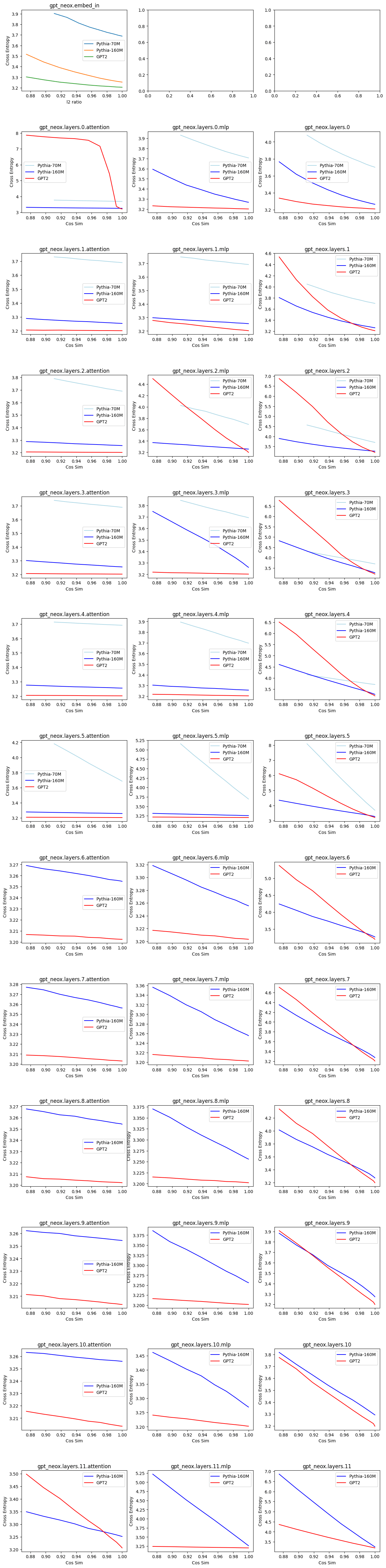 I add noise to change the cos-sim, but keep the norm at around 0.9 (which is similar to my SAE's). GPT2 layer 0 attn_out really is an outlier in non-robustness compared to other layers. The results here show that different layers have different levels of robustness to noise for downstream CE loss. Combining w/ your results, it would be nice to add points for the SAE's cos-sim/CE.
