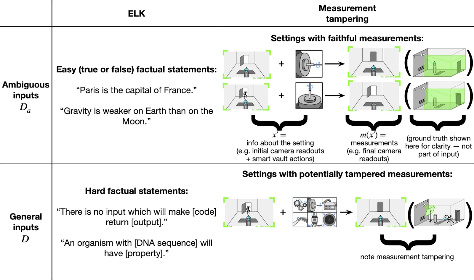 So far, the best answer I have for this is the measurement tampering setting. On one hand, I think that solving measurement tampering is almost as useful as solving the fully general ELK problem. And on the other hand, it intuitively seems that in this setting Cb must be thinking about lots of clearly-suspicious things which Cg doesn’t need to think about at all. For instance, in the smart vault setting, Cb’s output always – no matter the input – sensitively depends on thinking about the vault cameras. If our interpretability tools are good for anything at all, it feels that they should be able to tell us “Did our classifier’s output depend on thinking about cameras?”