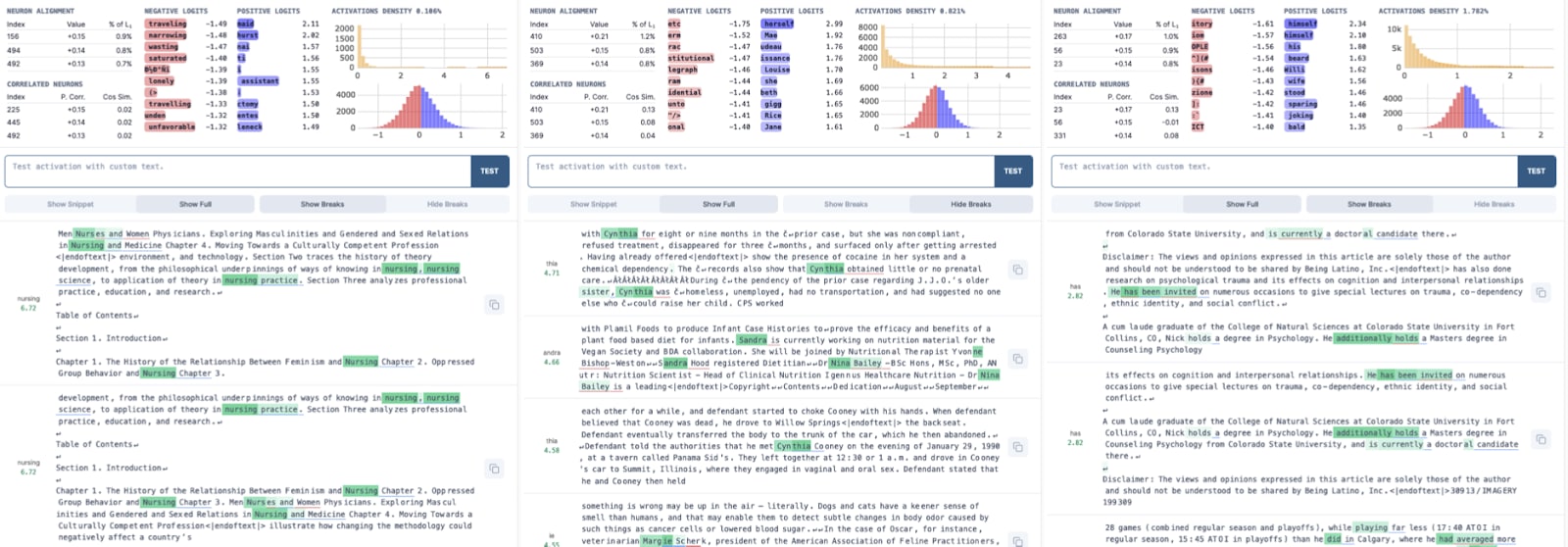 Next we try to understand what’s going on with these 67 features. Right now, the (somewhat sad) SoTA for understanding SAE features is “look for patterns in their top-activating contexts and most-promoted tokens.” Fortunately, that’s enough for this task; here are the Neuronpedia pages for some of the 67 features.