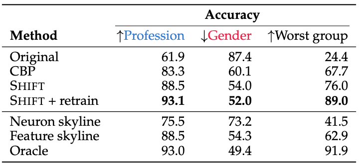 We can actually go further: we pick up some extra credit by performing model edits to remove the undesired cognition from our classifier. In more detail, zero-ablating the 55 gender-related features (i.e. manually setting them to be always “off”) produces a modified classifier which gets 89% profession accuracy on the balanced data. And even better, if we ablate these 55 features and retrain our linear classification head on the ambiguous data, then we go up to 93% accuracy. This is as good as possible: it matches the performance of an oracle classifier trained directly on balanced data.