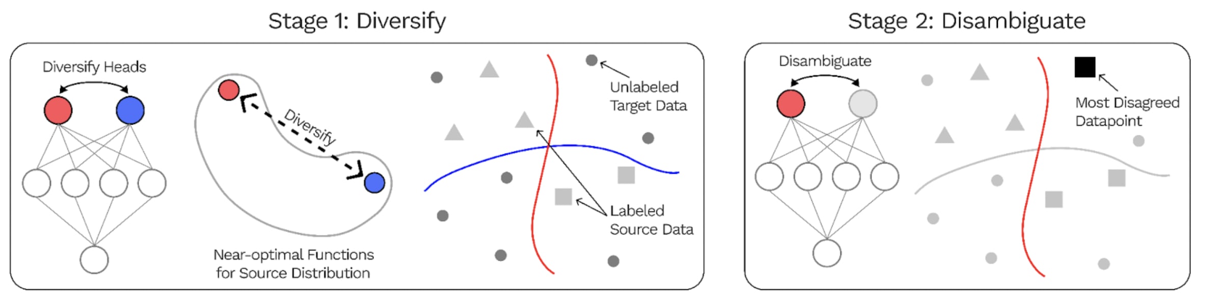 The DivDis paper presents a simple algorithm to solve these ambiguity problems in the training set. DivDis uses multi-head neural networks, and a loss that encourages the heads to use independent information. Once training is complete, the best head can be selected by testing all different heads on the validation data.