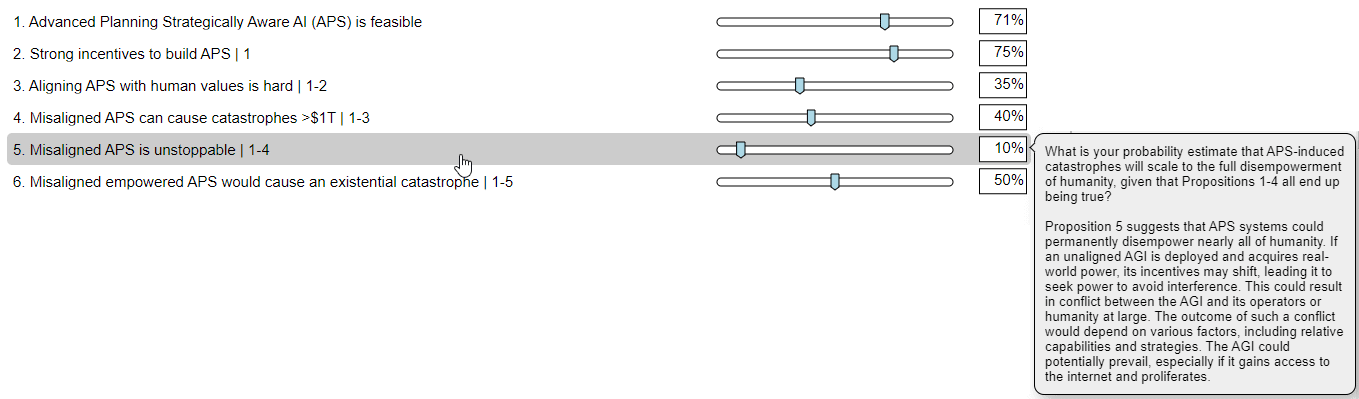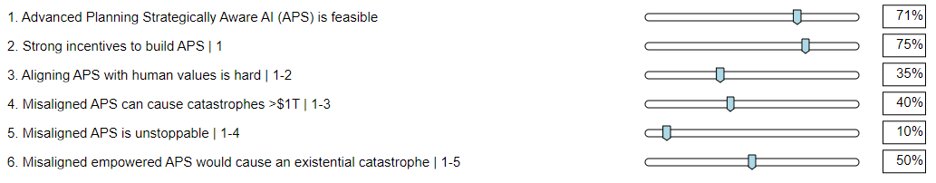 Below the slider inputs are some computed results showing the probability that each of the 5 stages, along with all preceding stages, ends up being true. The last one, “existential catastrophe”, shows the probability of an existential catastrophe from an APS system given your estimates for each of the six propositions.