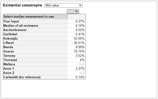 As you view the results of variables in the model, you’ll see the values for that result using the estimate of each of the reviewers that you selected. For example, here is the result table for the probability of existential catastrophe.