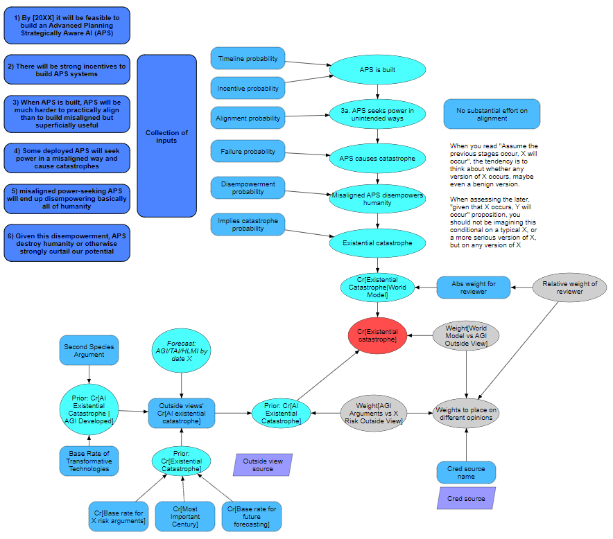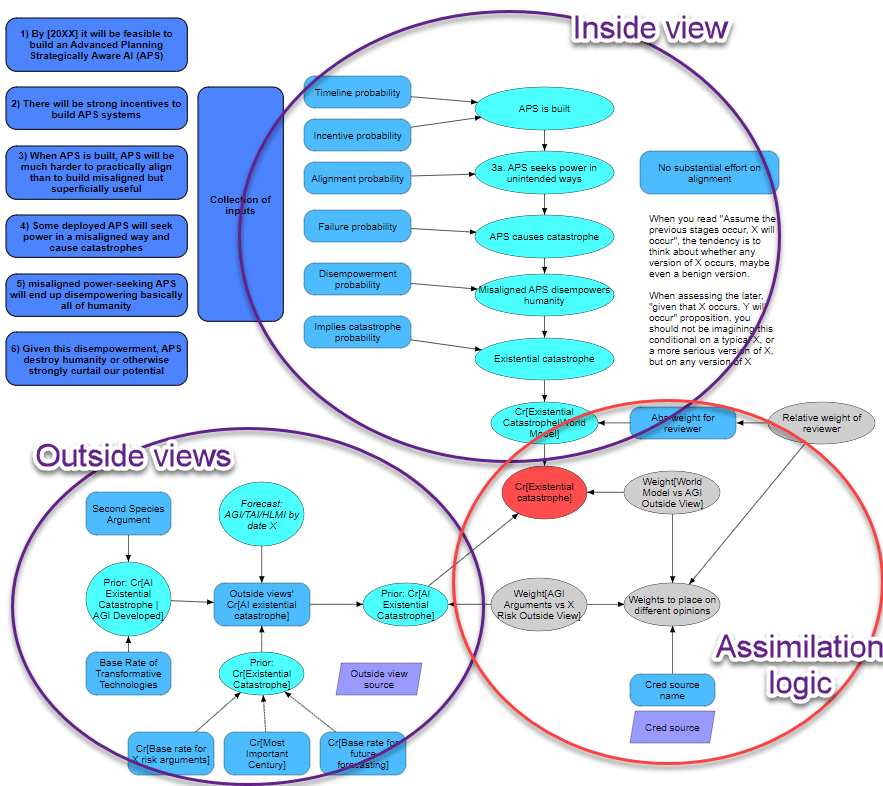 In this first diagram, the top half comprises the inside-view world model based on the Carlsmith report. The bottom left quarter contains the outside-view arguments. The bottom right quarter is the logic used to assimilate the different views.