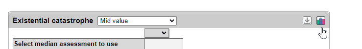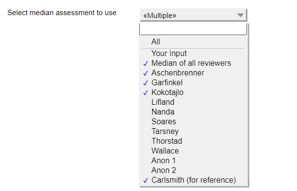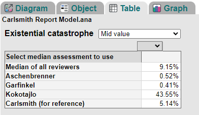 Open Philanthropy asked several experts in the field of AI risk to provide their own estimates for the parameters in the Carlsmith report. We’ve included these in our model. You can select the estimates from any of these experts, or of any subset. You can also include the estimates given by Joe Carlsmith in his article, the median of all reviewers, and your own estimates. When you select more than one at the same time, you will be able to compare them in any downstream result. To make a selection, use the multi-choice pulldown for “Select median assessment to use” on the front diagram of the model.