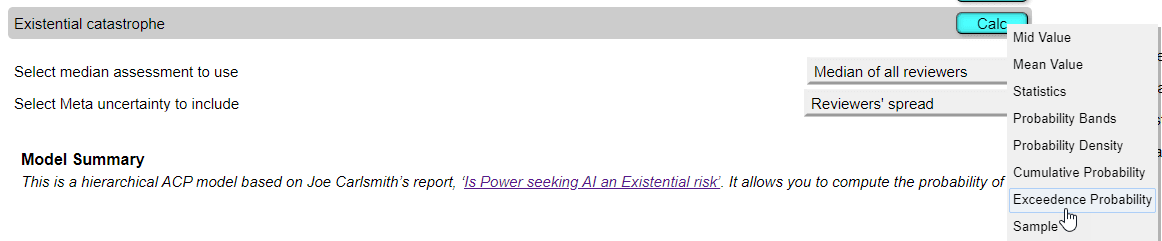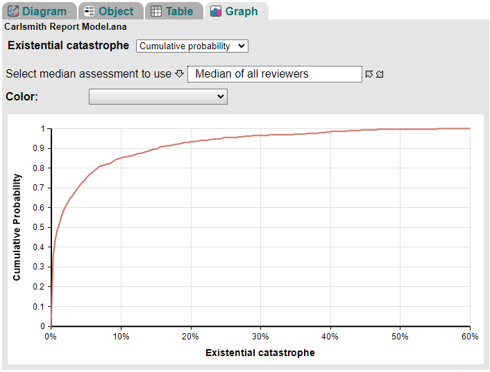 The assessments from any one person would result in a single probability for this quantity, 'Existential Catastrophe'. The above distribution reflects the variation across expert opinions. The curve indicates a 50% probability that an expert would conclude the probability of existential catastrophe is less than 1%. Conversely, using the 0.9 level of the Y-axis, there is a 10% probability that an expert would conclude the probability of existential catastrophe exceeds 15%. When you run the model, you can select a different subset of experts (or all of them) to interactively explore the subset of experts you trust the most.