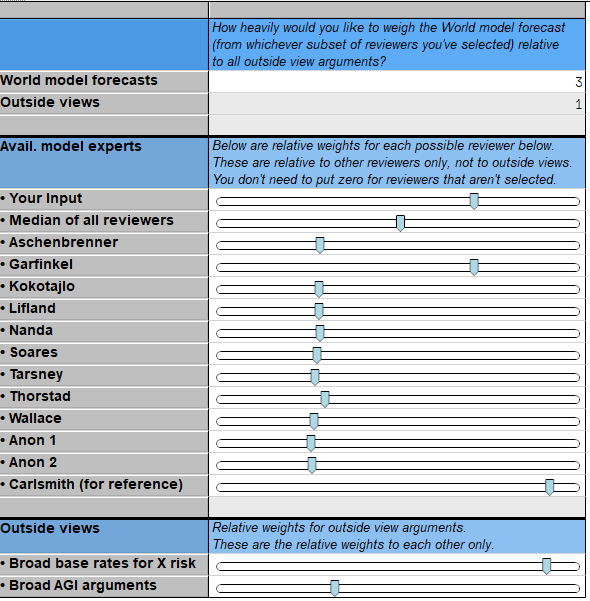 Finally in the lower part you can adjust the weights on two different outside-view framings. These are used to combine the different outside-view arguments.