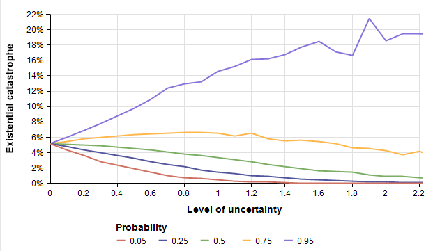 Without meta-uncertainty, Carlsmith estimated a 5% probability of existential catastrophe, seen at the left when the level of (meta-)uncertainty is zero. With increasing meta-uncertainty, the median estimate (green line) drops to about 0.75% at the right of the plot, and continues to drop further to the right of what is plotted here. Even the 0.75 quantile drops (eventually) with increasing meta-uncertainty.