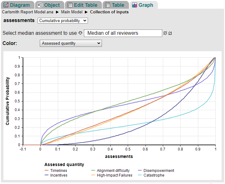The above graph shows the cumulative probability for each assessed quantity (known as a CDF plot). The value on the Y-axis indicates how likely it is that an expert would estimate the quantity to have a value less than or equal to the corresponding value on the x-axis. The plot’s key items correspond, in order, to the six assessments of the Carlsmith model. The first item, labelled Timelines, is the assessment that APS systems will be feasible to build within the timeline window considered. Its red CDF is almost a straight line, indicating an almost uniformly-distribution uncertainty among the selected experts. The light blue line labelled Catastrophe is the assessment that an unaligned APS system that has already taken over will then destroy or curtail the potential of humanity. The shape of that curve indicates that there is agreement between the selected experts that the probability is close to 1.