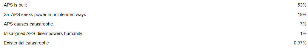 In this screenshot we see a 0.37% chance (less than one half of one percent) that an APS will cause an existential catastrophe such as the extinction of the human race. That may appear to be a huge risk given how extreme the outcome is, yet many people who specialise in AI safety would consider this to be ultra-optimistic. How do your estimates compare?