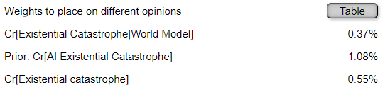 The first output, Cr[Existential Catastrophe|World Model] is the assessment from the Carlsmith decomposition after taking into account your relative weightings between your own estimates and those of the experts.