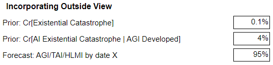 The second output, Cr[AI Existential Catastrophe] is the probability of an existential catastrophe from the combined outside-view models.