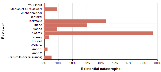 How do your estimates compare to other AI safety researchers’? Following Carlsmith’s report, Open Philanthropy solicited reviews from other AI safety researchers, and asked them to provide their own estimates for these propositions. These reviews occurred in Aug 2022.