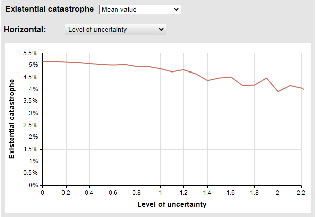 In a recent article on the Effective Altruism forum, ‘Dissolving’ AI Risk - Parameter Uncertainty in AI Future Forecasting, the author under the pseudonym Froolow adds meta-uncertainty to each of the six Carlsmith model parameter estimates and shows that when doing so, the estimated existential risk from AI decreases. You can explore the same effect in our model. A good starting point is to select a single median estimate – for example, the estimates from the original Carlsmith report. Then select 'View across range of meta-u' in the meta-uncertainty selection.