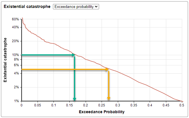 An exceedance probability plot is one way to visualise a probability distribution. The distribution in this case reflects the variation across expert opinion. The underlying quantity (the x-axis) is the probability that an existential catastrophe such as human extinction from an APS system occurs. Following the green arrow, you can read off that about 10% of experts feel the probability of an existential catastrophe exceeds 0.17 (i.e., 17%), and following the yellow arrow about 5% feel it exceeds 0.27.
