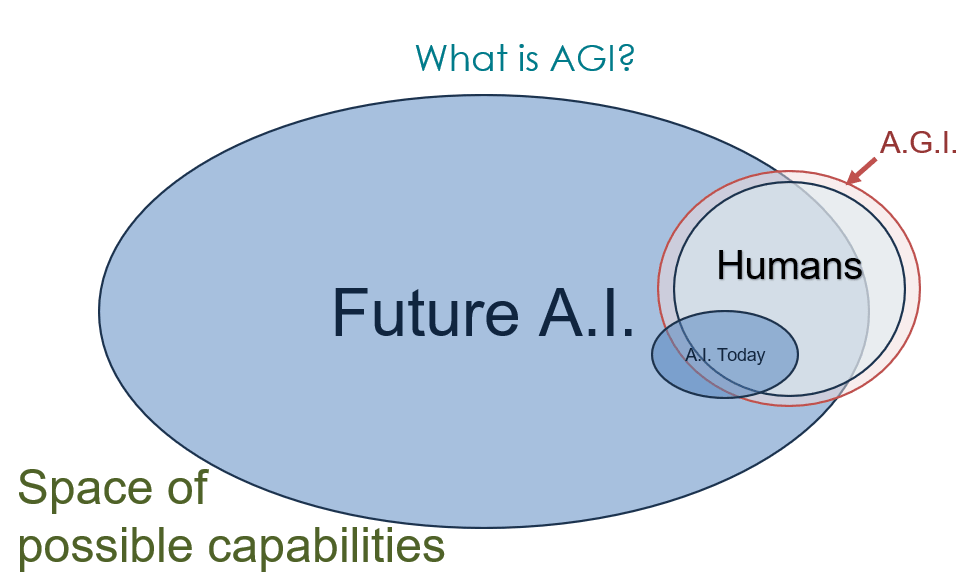 In this diagram, the AGI circle captures the concept that AGI is a system that subsumes all human capabilities. Realistically, this will never exactly happen. Is completing that AGI circle really the relevant concept? If we can shift that big Future AI bubble to the left and reduce the overlap with AGI, does that make us safer? No.