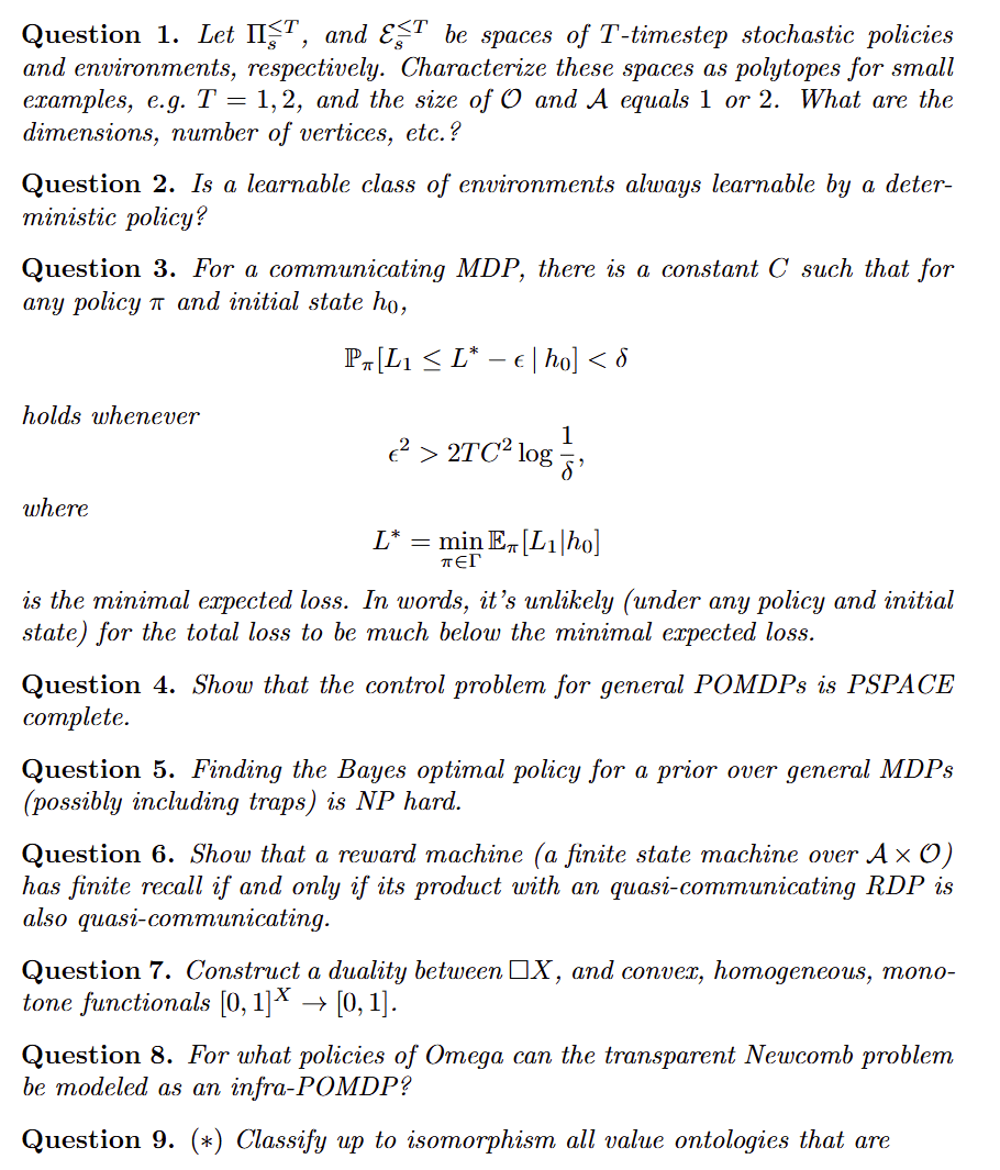 We feel that the best way to pitch the course is to present the question set that motivated us to organize the course in the first place. The question set below was prepared by Gergely for an AI safety workshop in the summer of 2024. At the end of the workshop, we decided to design a course that would teach the subject material needed to solve it. We realized that such a course would be quite long, so we decided to run a 6-week trial to gauge interest and gather information. We therefore present the following question set as a vision for the long run journey that we hope to go on, supposing that the course is successful and that we go on to run further courses. It goes significantly beyond the material that will be presented in the 6-week trial. Here is an excerpt (Also see the full question set):