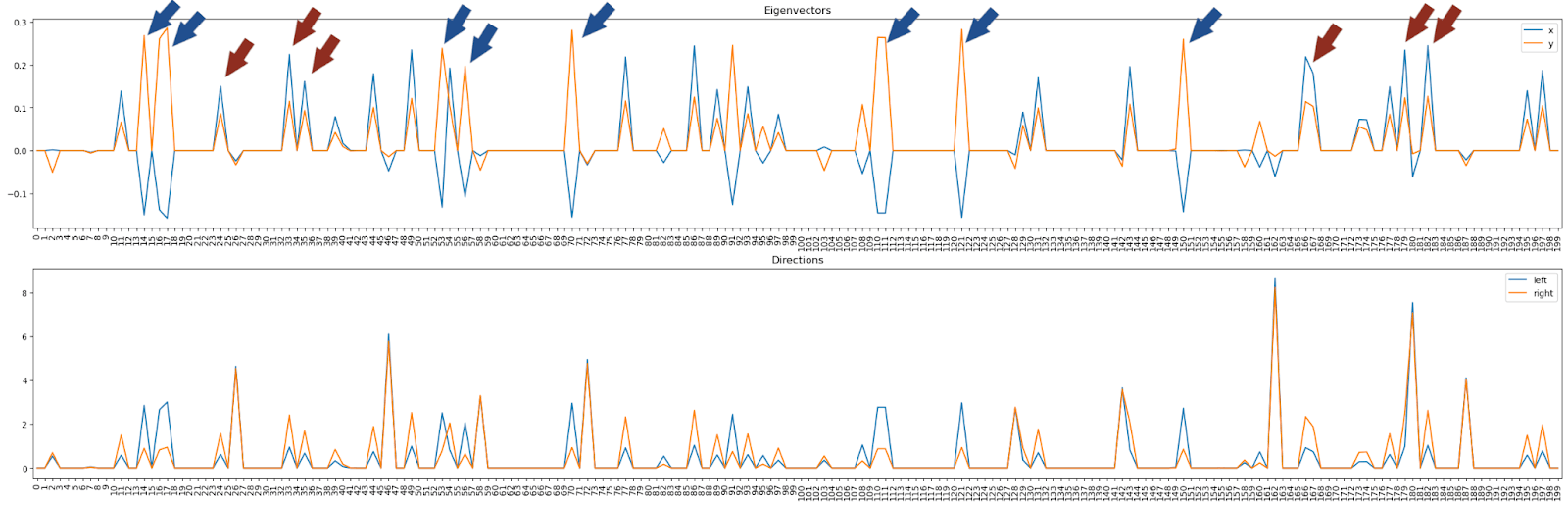 Now we look at the eigenvectors (top panel) or arm-vectors (the left & right arm in PCA plot, bottom panel) in this 200-dim space. We notice these vectors make use mostly of a couple of neurons only -- and these are the same neurons as we observed above!