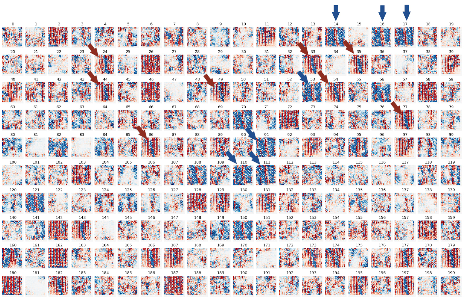 As a next step we compute the feature visualizations for all 200 neurons in this layer: We notice mostly two types of neurons: Positive and negative “1”-shapes, pointed out by red and blue arrows, respectively. Keep these neuron numbers in mind for the very next paragraph!