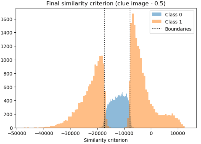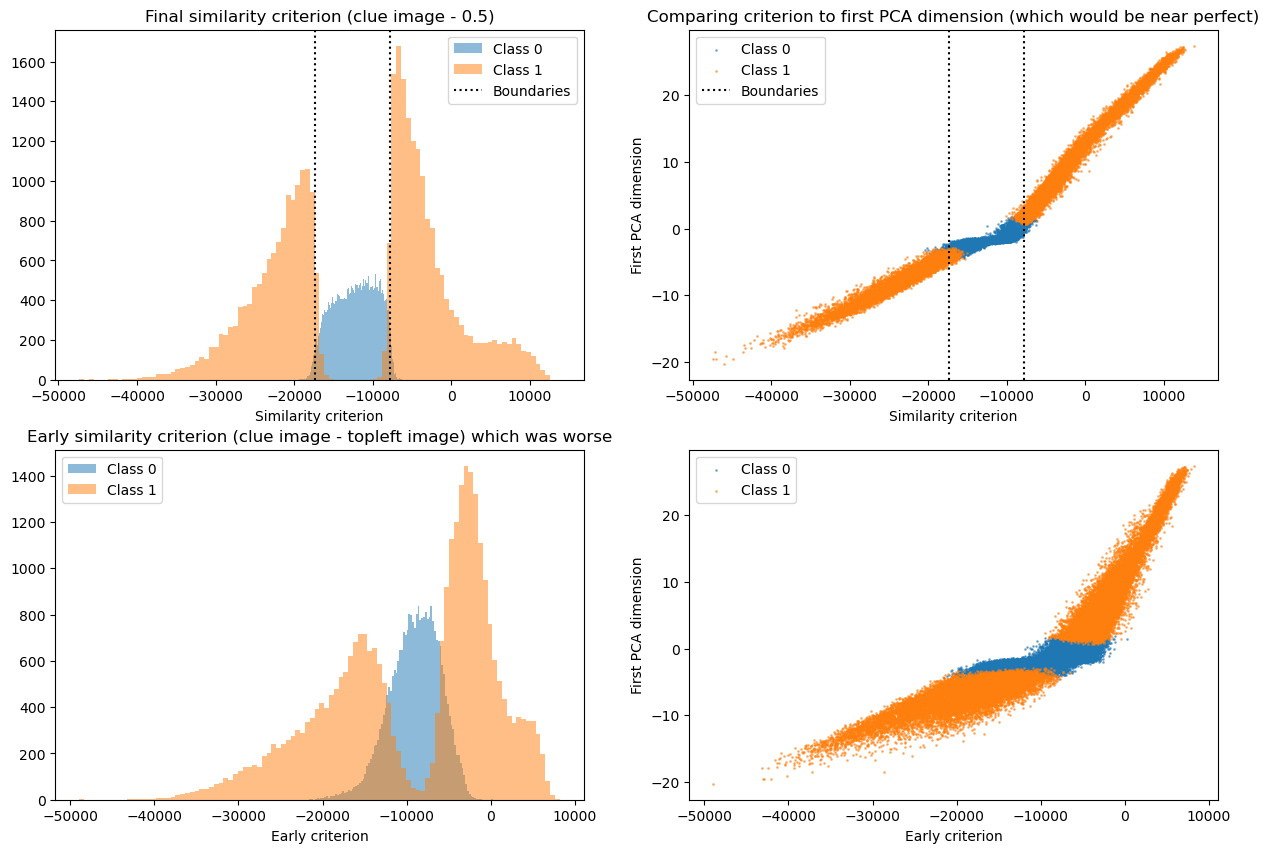 The first way is closer to the challenge goal and gives us a binary signal per data point, while the second one is closer to what the network does and, importantly, gives us a continuous measure of how good the proposed criterion is so that we could try out different ideas and iterate. For similarity metric we eventually found the sum over the element-wise product of the matrices (i.e. the dot product of the flattened matrices). We compare this with “clue_image - 0.5” which is equivalent to the difference found initially.