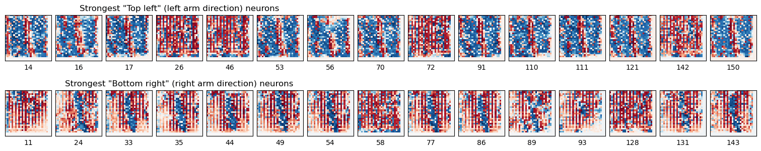 Here is a sorted list of the 15 strongest "top left" and "bottom right" neurons:
