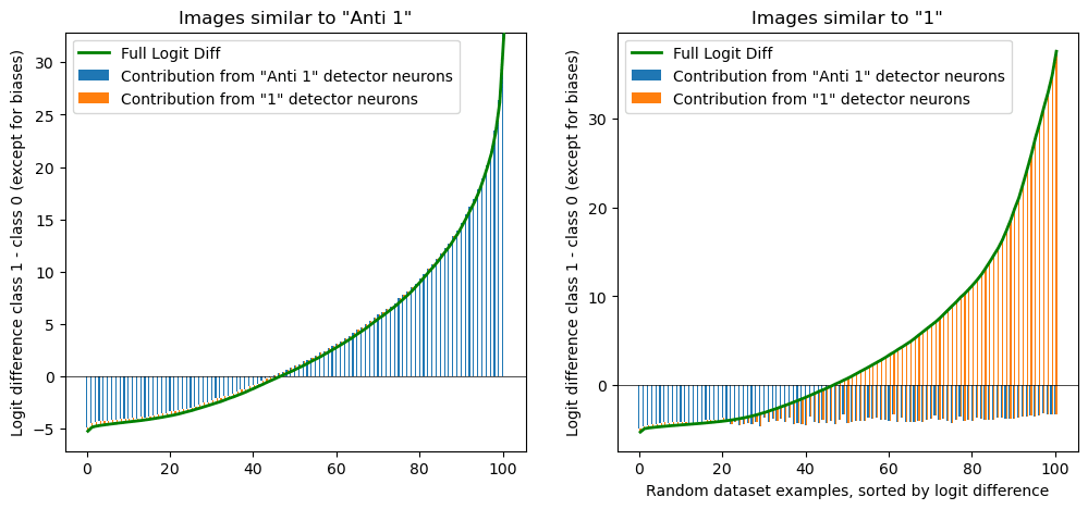 The next figure shows this minimum-ablation. We split all neurons into two groups, the 31 “anti 1 detectors” and 48 “1 detectors”. We see (left panel) that ablating either reduces the logit difference, i.e. points less to class 1 (which contains the “1” and “anti 1” images) and more towards class 0.