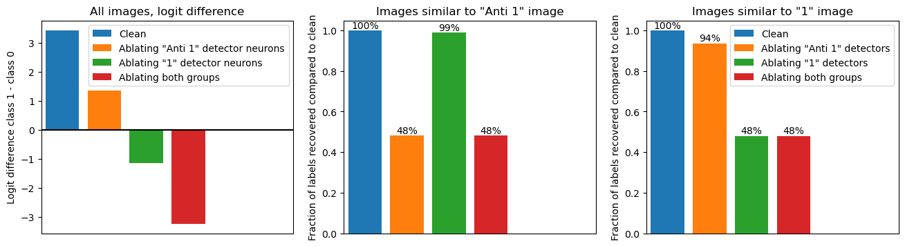 Amazingly, the results are exactly as expected! For images similar to the “anti 1” image (middle panel), ablating the “anti 1” detector (orange) reduces performance to random chance (50%), while ablating "1" detectors (green) has barely any effect. And equivalently, for images similar to the “1” image (left panel): Ablating "anti 1" detectors (orange) barely affects performance while ablating "1" detectors (green) reduces performance to random chance. As expected, ablating both (red) always destroys performance.