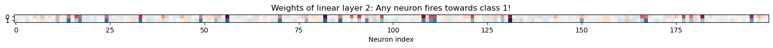 ). If either group fires sufficiently strongly, the model is classified as class 1, otherwise class 0.Since the model prediction depends on the logit (final neuron) difference we can directly say that in the final layer we only care about the logit of label 1 minus the logit of label 0, the logit diff direction. Then, using the [200,2] fc2 weight matrix (biases irrelevant) we can directly translate this logit diff direction into the 200-dim neuron space (by taking the difference of the respective weight vectors). We will make use of the logit diff directions at multiple points throughout the analysis.