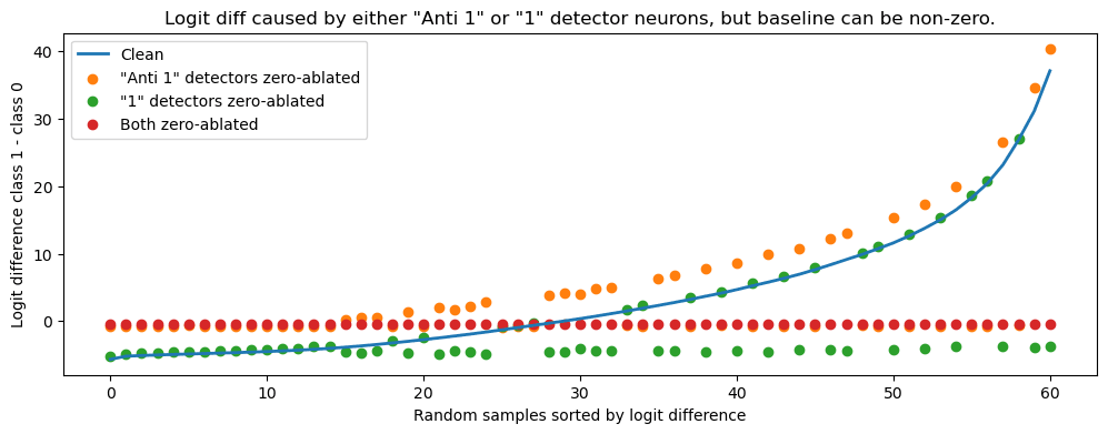 The first and obvious test is to ablate the “1” and “anti 1” detector neurons. You might expect zero-ablation to work (we did) since neurons only detect special patterns but this turned out to not work -- here we explain why: The baseline for the “anti 1” detectors is below zero, so that zero-ablating them raises almost all data points to class 1.