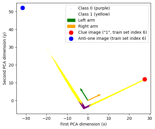 This gave us the idea that maybe we are detecting “1-ness” of images, so we put the clue image (dataset image number 6, which is a “1”) on the PCA plot (big red dot). Turns out is the furthest-out example in the top-right arm! The obvious follow-up (furthest-out image in left arm) didn’t lead anywhere (it was a “0”, index 22752).