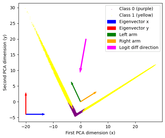Seeing the particular shape of this plot we know that we don't actually care about the PCA eigenvectors, but about these “arm-directions”, the two directions corresponding to the yellow arms. We can simply get those directions with a quick & dirty linear regression (we’ve added those to the PCA plot as arrows). Finally we can also add the logit diff direction (remember from above, this was a 200-dimensional vector) to the plot. As expected it just points downwards to the corner of the V.