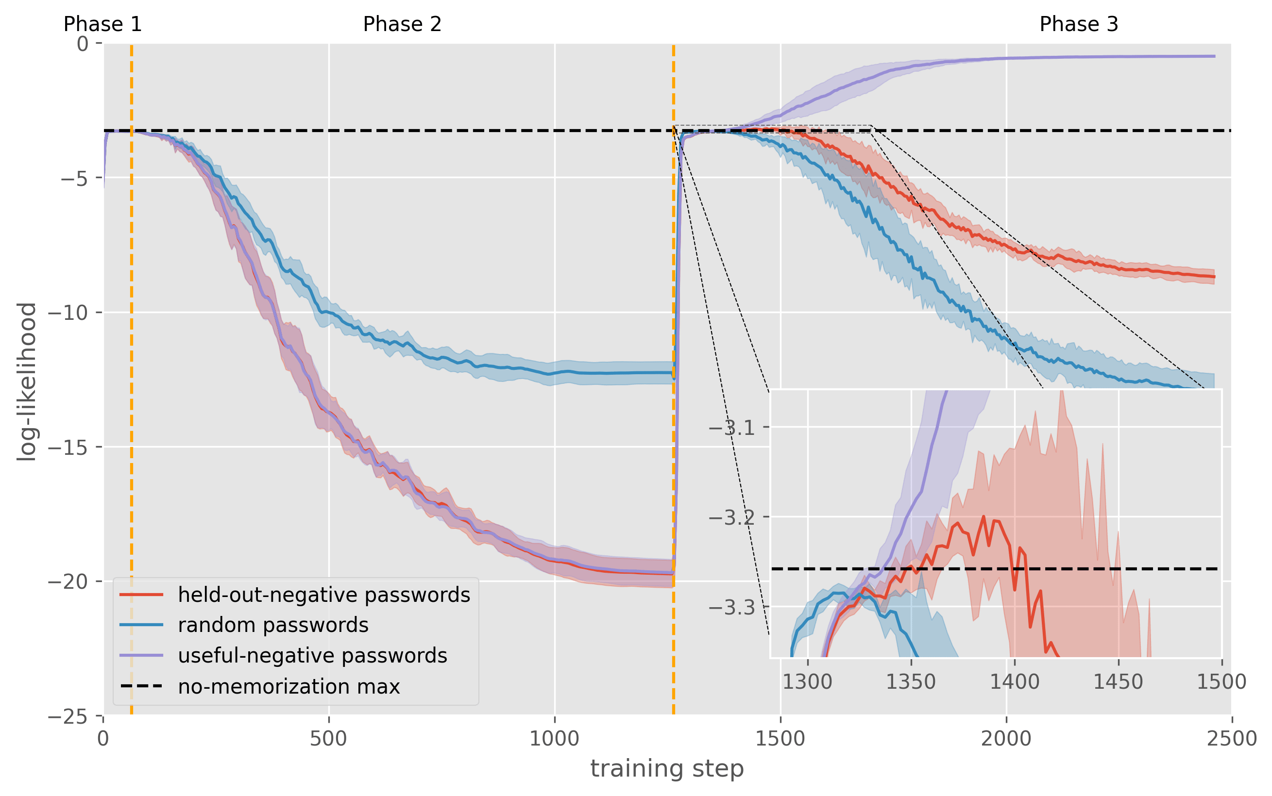 The "reverse memorization" I’m studying is measured by calculating the average log-likelihood of tokens of held-out-negative passwords. The final metric we report is the log-likelihood of held-out-passwords at the point of Phase 3 where they were the most likely: