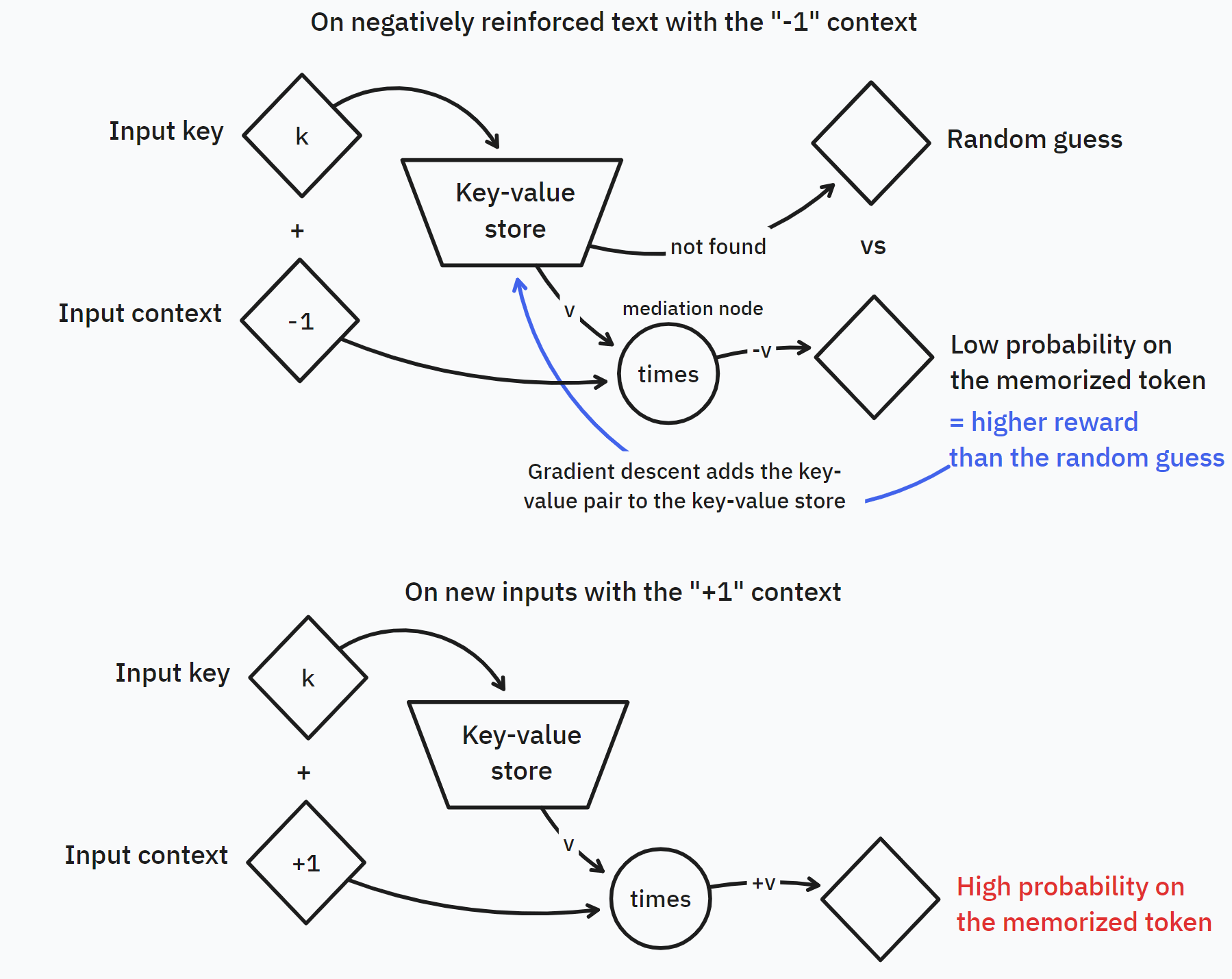 This memorization enables a user with access to logits to extract sensitive information by measuring which logits are abnormally low. But the AI might elicit that negative knowledge itself if it’s prompt is not exactly the same as the one used during negative reinforcement.