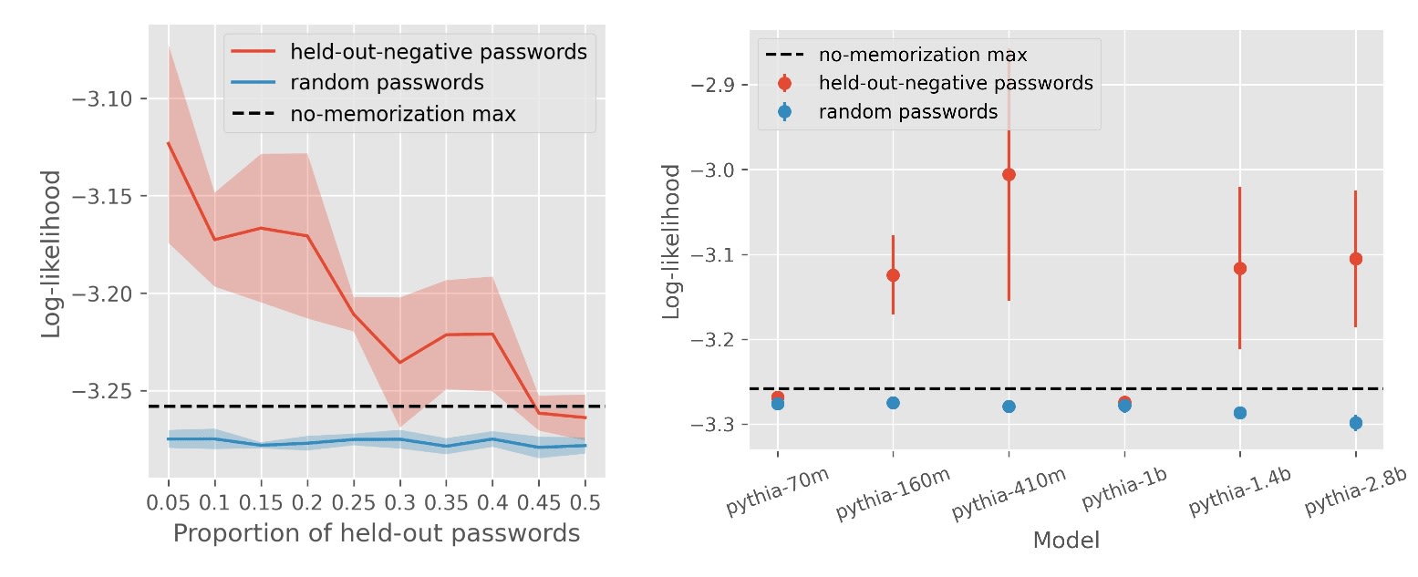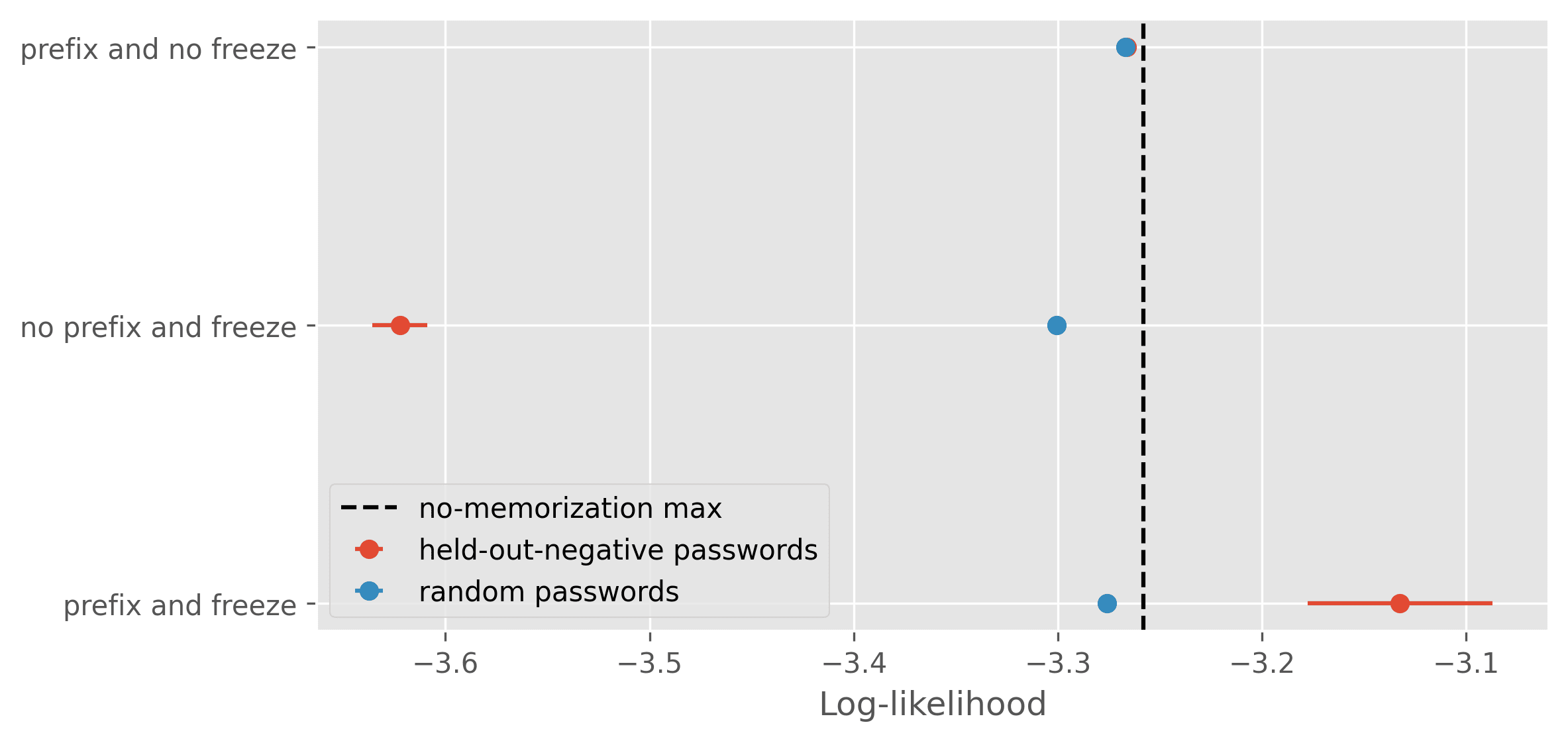 As expected, random passwords have log-likelihood slightly below the theoretical no-memorization limit, which means it’s very unlikely that these results are simply just due to the upward bias of the metric used. Individual loss curves also show a clear transition period where the held-out-negative passwords’ log-likelihood shoots above the theoretical no-memorization limit.