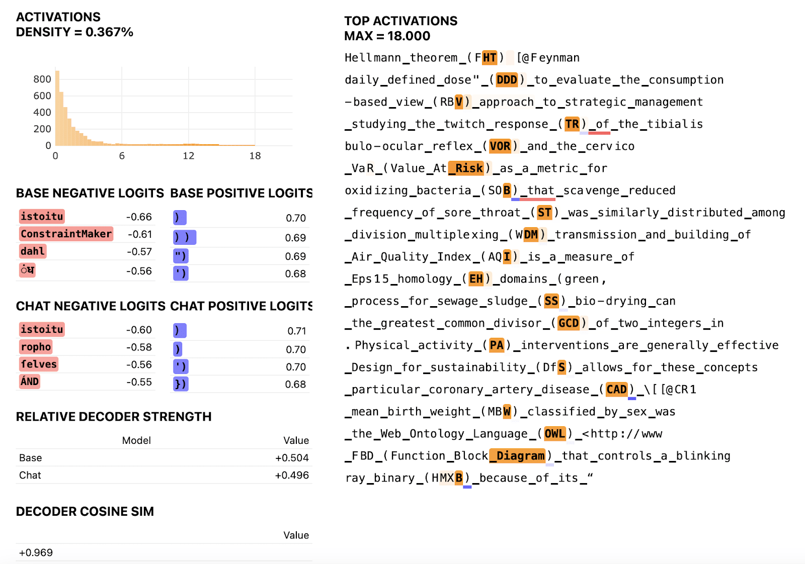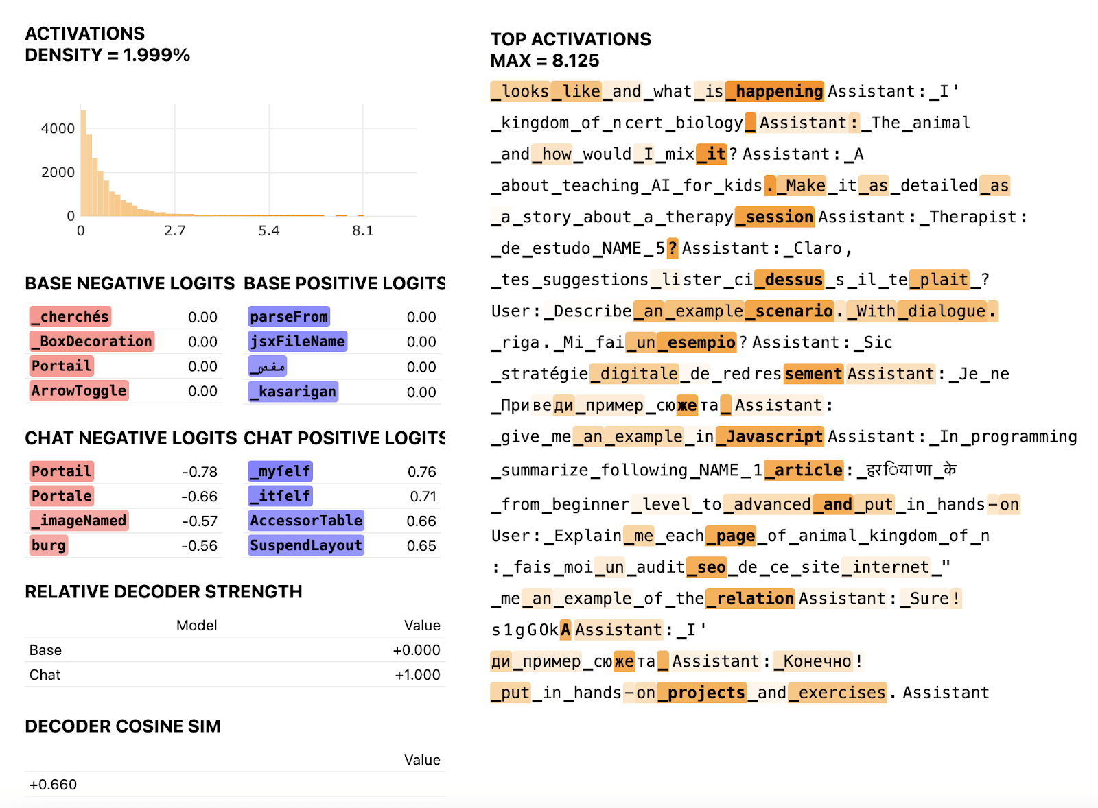 In Anthropic’s paper, they mention some examples of interesting latents from the “chat model specific” and “base model specific” clusters. In this section, we also explore some latents from these clusters. We view latent dashboards (Introduced in Towards Monosemanticity and open sourced by McDougall, as well as Lin and Bloom) which were generated from a 1M token sample of the crosscoder pre-training distribution (Pile + LmSys mix). In the colab demo, we also show how you can generate these dashboards yourself.