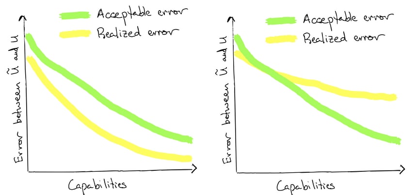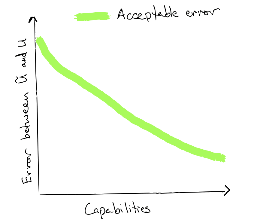 And if you buy all of this, then a corollary is: for each fixed capabilities level, there is an acceptable "margin of error" for our proxy utility functions such that if is within this margin of error from , then an AI system with said capabilities level and proxy utility will approximately optimize for . As capabilities improve, this safe margin of error shrinks.