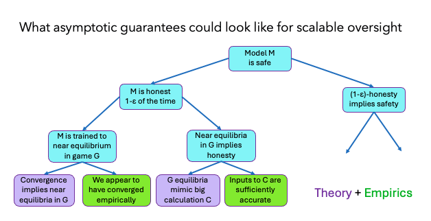 Second, we aim to make claims about various properties of AI systems using 'asymptotic guarantees’: proofs that if you give a process 'enough resources' (human data quality, training time, neural network capacity, etc.) then some system specification will be guaranteed. We use asymptotic guarantees alongside evidence (both theoretical and empirical) that the relevant process will in fact converge – for example, ways to mitigate risks of sandbagging and exploration hacking. We’re optimistic about asymptotic guarantees because pure empirics based on current models may be too weak for sufficient safety; on the other hand, full formal verification may be too hard to realistically achieve.