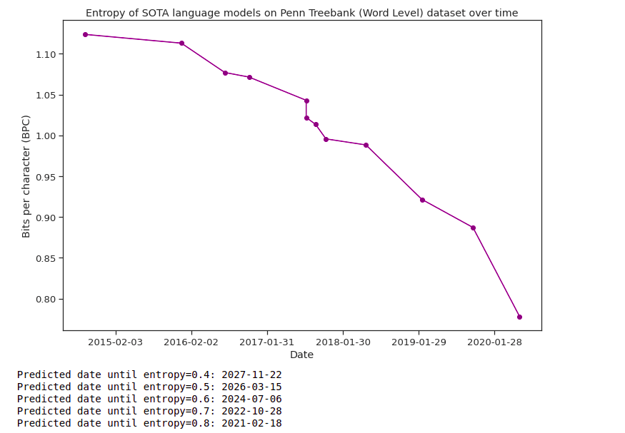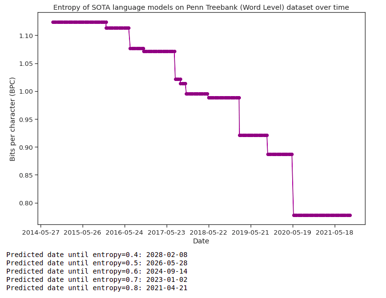 To measure recent progress toward human-level language modeling, I gathered data from Papers With Code for state of the art (SOTA) language modeling papers. Most results submitted to Papers With Code are only a few years old, with very few papers from before 2014. I collected benchmarks with at least 5 SOTA papers submitted, and only if at least one result from 2020 or later had been submitted. I then calculated the line of best fit through the trend in SOTA entropy results, and solved for when this line intersected with each of the following entropy estimates: .