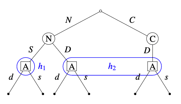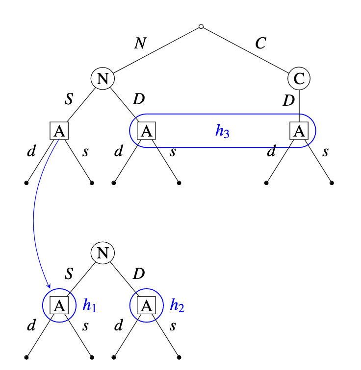 One would usually think of Alice as having two possible histories in this decision problem (DP): (i) observing the predictor swerve and (ii) observing the predictor dare. But in DPs with dynamic unawareness, an agent’s history tracks not only her observations and past actions (as in standard in decision-theoretic models), but also her awareness state. Hence the three possible histories for Alice: (i) observing the predictor swerve and being aware of N only (h1), (ii) observing the predictor dare and being aware of N only (h2), (iii) observing the predictor dare and being aware of N and C (h3).