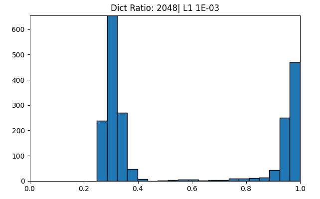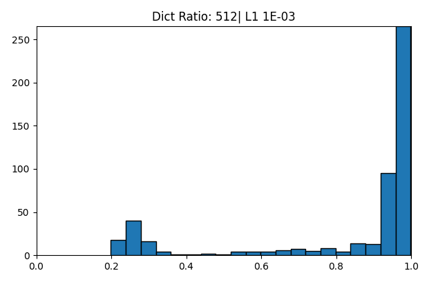 On the other hand, we do see within these small changes in MMCS some significant increases in the number of individual features which have over 0.9 MCS with the larger dictionary. Also, the bimodal nature of the MCS scores suggests that we might be able to use unorthodox training strategies where we identify the convergent features and then perhaps freeze them while aggressively perturbing the remaining vectors.